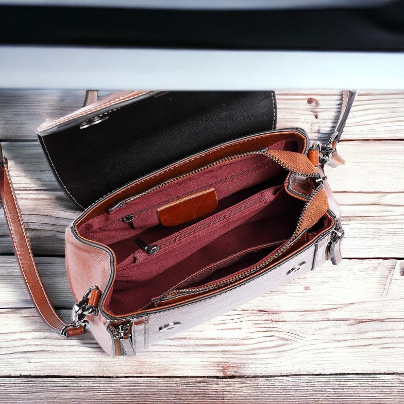 Cartera de mujer tipo BANDOLERA realizada en CUERO. Un diseño para destacar tu outfit. Tamaño mediano con buen espacio interior. Tiene 3 reparticiones de muy buena dimensiones. Para llevar todo lo que necesitas
