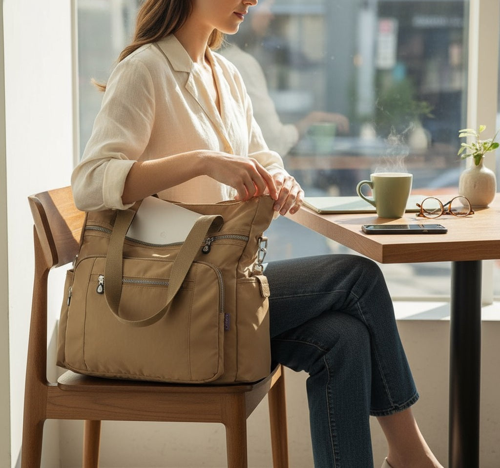 Cartera de mujer tipo bolso realizada en tela poliéster. Resistente al agua y con varios bolsillos de gran tamaño. Un diseño para destacar tu outfit. Tamaño GRANDE con buen espacio interior para llevar CUADERNOLAS Y NOTEBOOK.