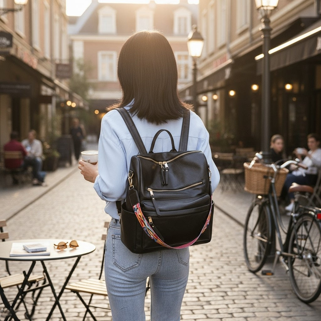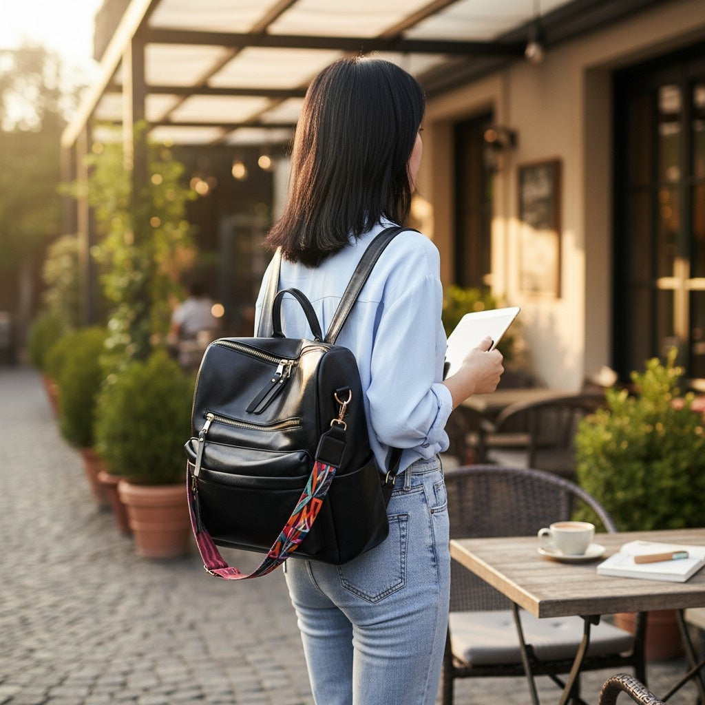 MOCHILA en cuero ecólogico de alta calidad. Ideal para VIAJES. Una combinación ideal entre DISEÑO Y TAMAÑO. Con finas terminaciones y tamaño adecuado para llevar NOTEBOOK de menos 14 pulgadas o CUADERNOLAS. Tiene bolsillo interiores, uno de ellos con cierres de buen tamaño. . Dispone en su reverso un bolsillo de seguridad y una correa para sujetar a tu valija.