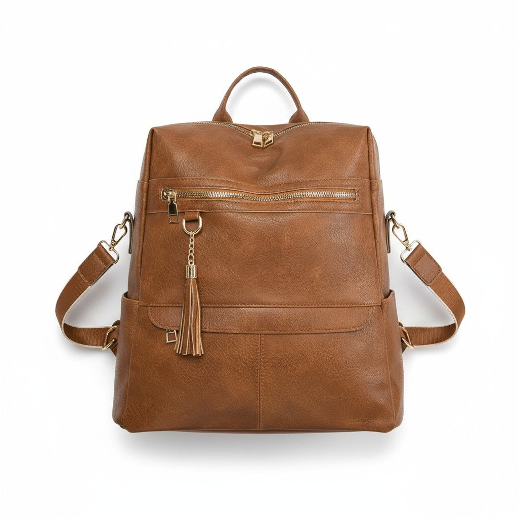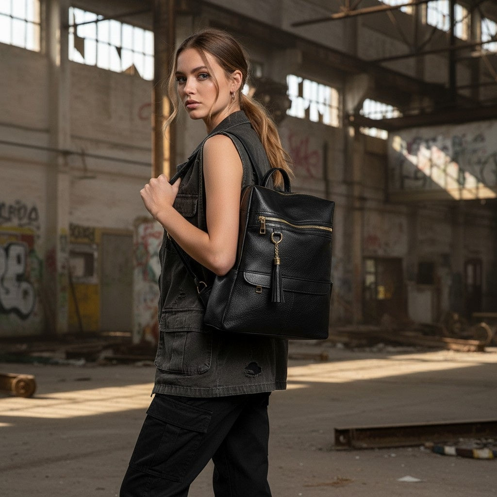 MOCHILA en cuero ecológico de alta calidad. Ideal para VIAJES. Una combinación ideal entre DISEÑO Y TAMAÑO. Con finas terminaciones y tamaño adecuado para llevar NOTEBOOK de menos 14 pulgadas o CUADERNOLAS. Tiene bolsillo interiores, uno de ellos con cierres de buen tamaño. . Dispone en su reverso un bolsillo de seguridad.